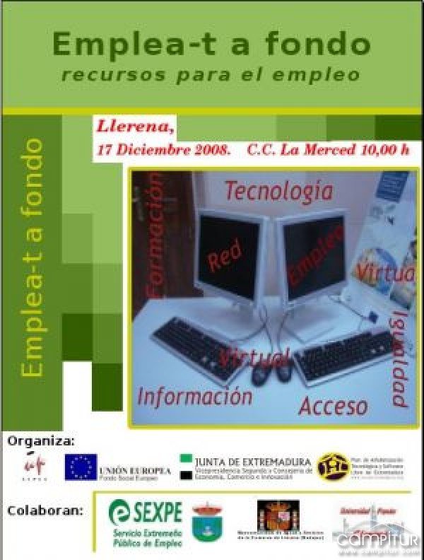 El Nuevo Centro del Conocimiento (NCC) de Llerena ha organizado una Jornada para Desempleados, "Emplea-t a fondo. Recursos para el Empleo", que se celebrará el día 17 de Diciembre en el Salón Juan Simeón Vidarte, en las instalaciones de Complejo Cultural La Merced de Llerena.