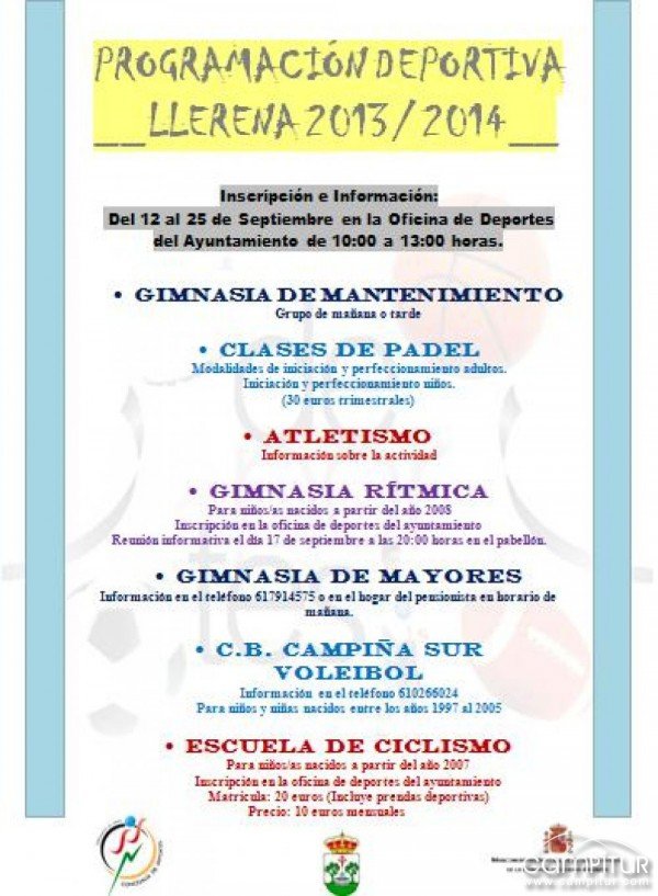 Desde la Concejalía de Deportes del Ayuntamiento de Llerena informan a todos los posibles interesados de que a partir de hoy, 12 de septiembre, quedará abierto el plazo para formalizar las inscripciones en las distintas actividades deportivas que se llevarán a cabo dentro de la Programación Deportiva ofertada como cada año por dicha concejalía.